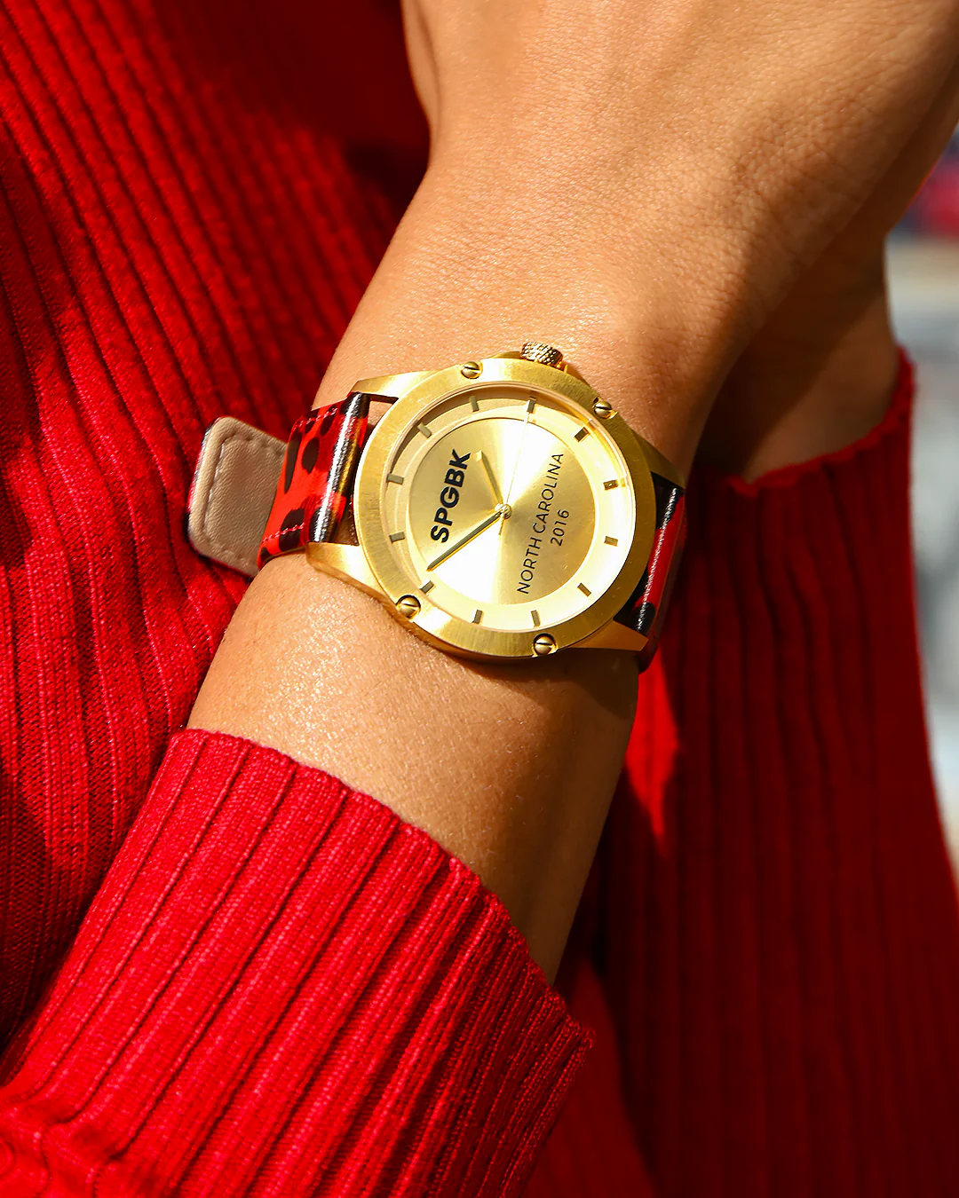 Introducing The Manchester - our newest classic watch! Featuring a luxurious gold face and a fashionable red leopard leather strap, this bold accessory will elevate any ensemble. Its refined gold tone is sure to capture attention and pays homage to a beloved school in Fayetteville, NC. Put it on and radiate self-assurance for all of your special occasions!