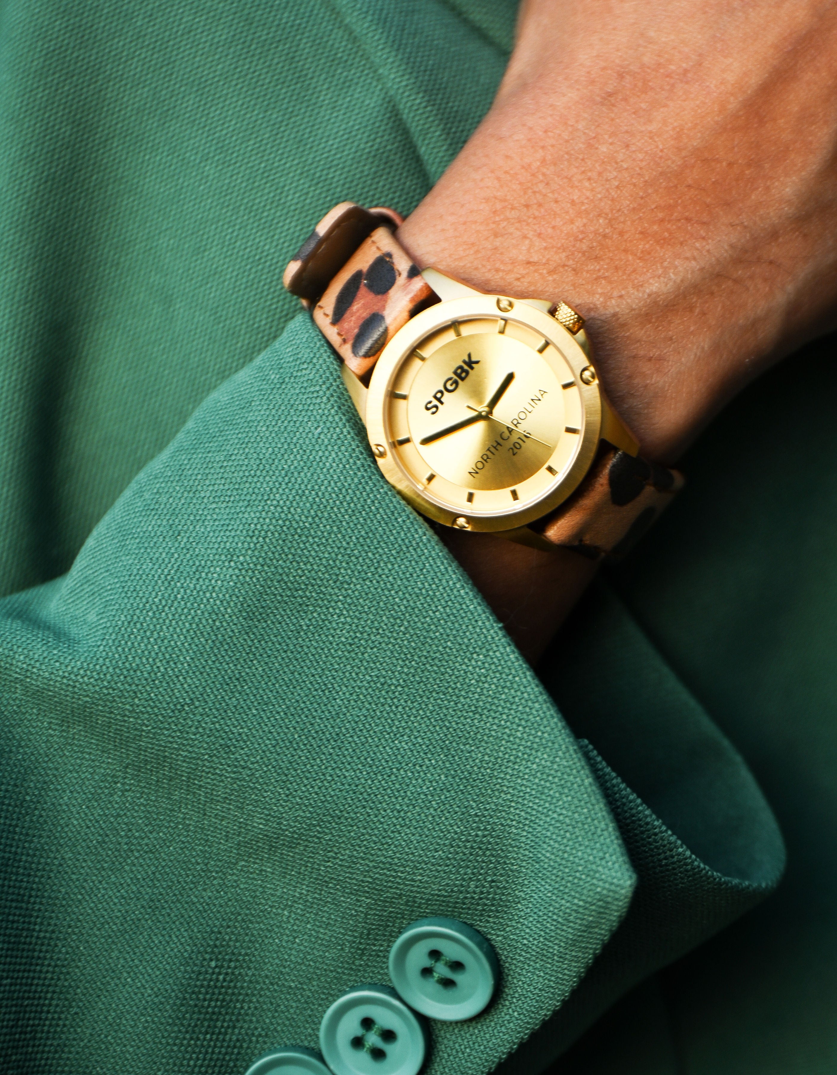 Presenting The Mary - our new petite ladies' timepiece! Boasting a luxurious golden dial and a sleek leopard leather band, this bold accessory is ideal for elevating any ensemble. Its sleek and sophisticated gold color is sure to catch attention, while also honoring a cherished school in Fayetteville, NC. Put it on and feel confident for all of life's occasions!